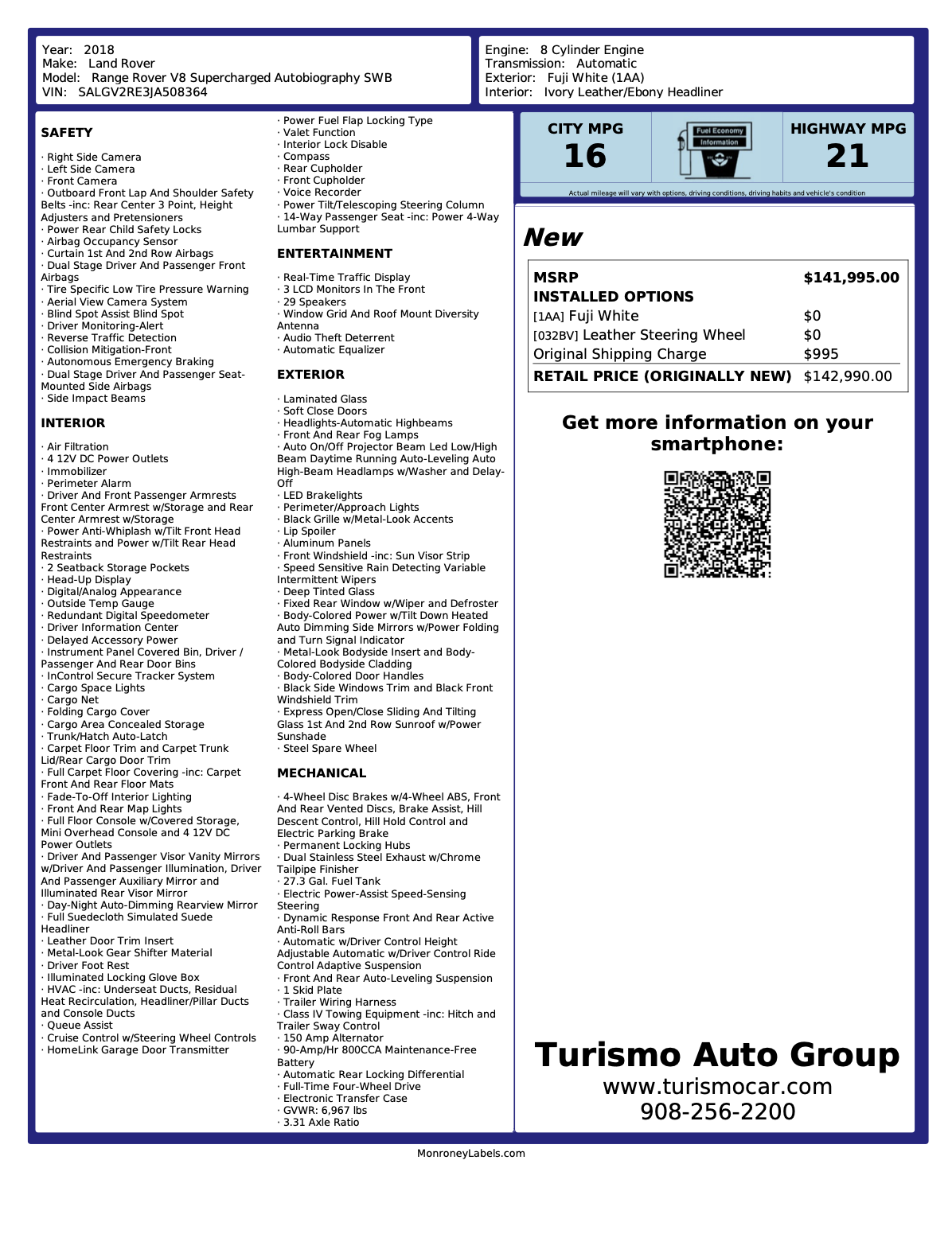 Turismo Auto Group is proud to offer this 2018 Land Rover Range Rover V8 Supercharged Autobiography, finished in Fuji White over Ivory leather with an Ebony headliner. With just 35,271 miles, this short-wheelbase Autobiography presents in excellent condition inside and out and shows a clean, accident-free Carfax. It has been dealer-serviced throughout its life and retains all of its factory equipment as delivered new.