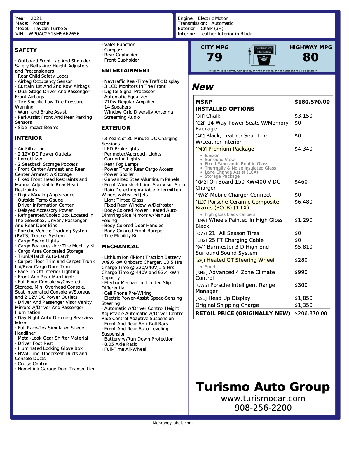 Turismo Auto Group is proud to offer this exceptionally well-optioned 2021 Porsche Taycan Turbo S, finished in Chalk over a Black leather interior with just 10,875 miles. This is one of the most compelling modern performance cars on the market—delivering supercar acceleration, everyday usability, and the added benefit of avoiding the pain of today’s fuel prices altogether. For the enthusiast looking for a true dual-purpose vehicle, the Taycan Turbo S stands alone as a car that can dominate a back road while remaining one of the most refined and usable daily drivers ever produced.